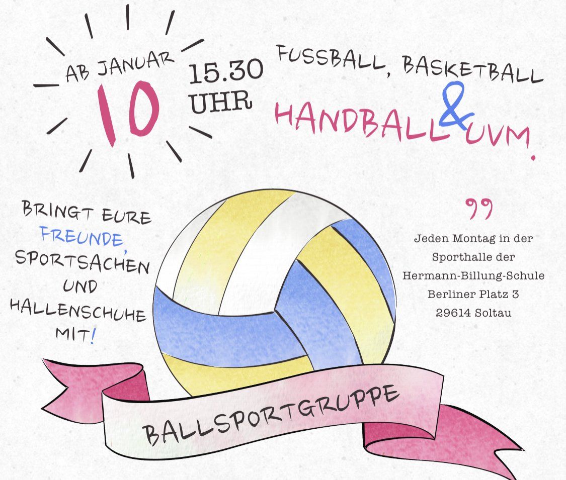 Die Ballsportgruppe bietet Kids ab 8 Jahren die Möglichkeit, sich in verschiedenen Ballsportarten zu erproben. Das Treffen mit Gleichaltrigen, die Lust auf Kicken, Werfen und Co. haben, ist dabei inklusive. Durch eine enge Verzahnung mit örtlichen Sportvereinen wie dem SV Soltau e.V. und dem MTV Soltau e.V. ist ein eventueller Übertritt in die jeweilige Sportabteilung des Vereins erleichtert.