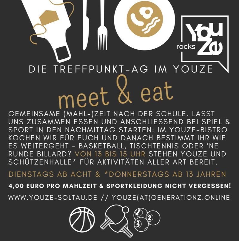 GEMEINSAME (MAHL-)ZEIT NACH DER SCHULE. LASST UNS ZUSAMMEN ESSEN UND ANSCHLIESSEND BEI SPIEL & SPORT IN DEN NACHMITTAG STARTEN: IM YOUZE-BISTRO KOCHEN WIR FÜR EUCH UND DANACH BESTIMMT IHR WIE ES WEITERGEHT - BASKETBALL, TISCHTENNIS ODER 'NE RUNDE BILLARD? VON 13 BIS 15 UHR STEHEN YOUZE UND SCHÜTZENHALLE * FÜR AKTIVITÄTEN ALLER ART BEREIT. DIENSTAGS AB ACHT & *DONNERSTAGS AB 13 JAHREN AB SOFORT GRATIS WWW.YOUZE-SOLTAU.DE // YOUZE(AT)GENERATIONZ.ONLINE